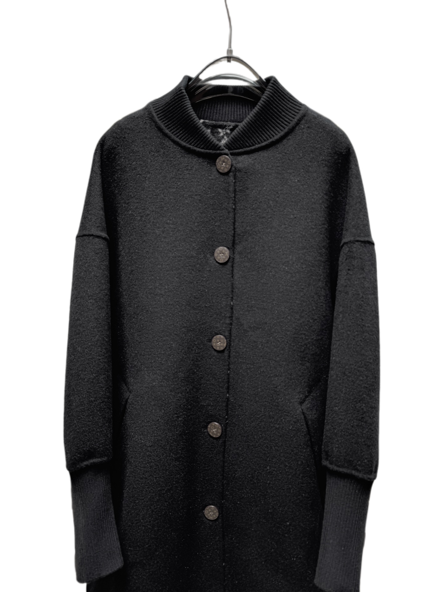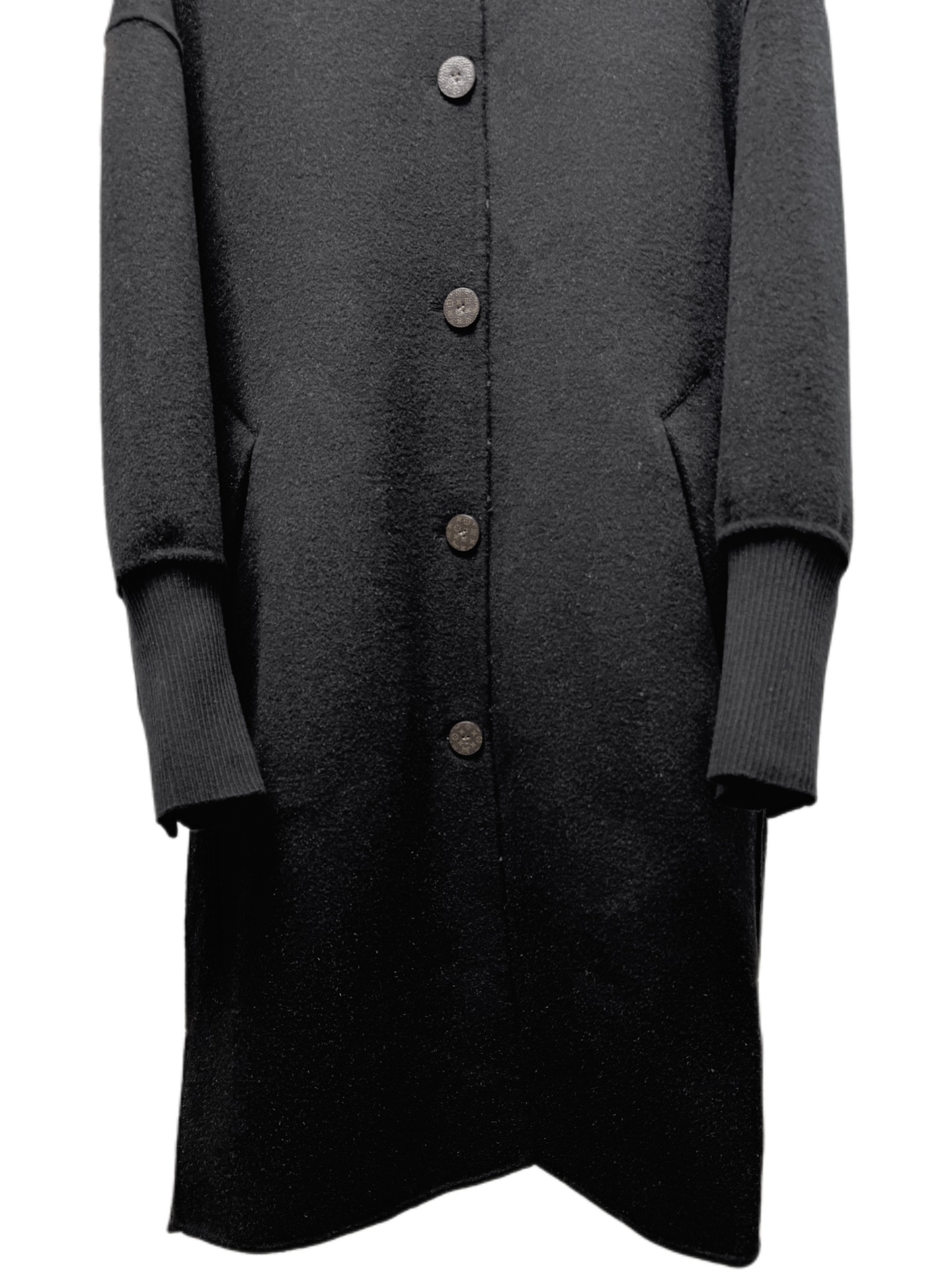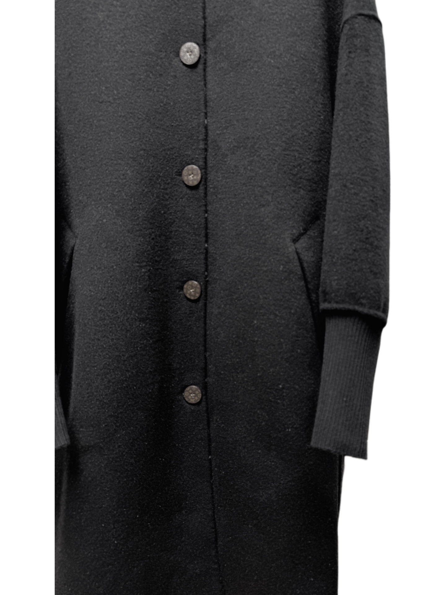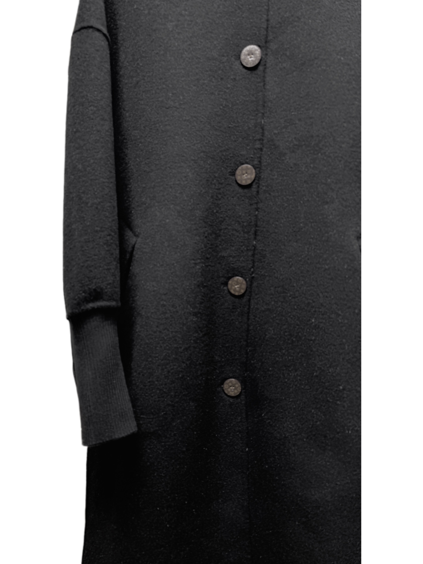 Details: Black knitted long coat, sizes 34-40, 99% wool, 1% silk