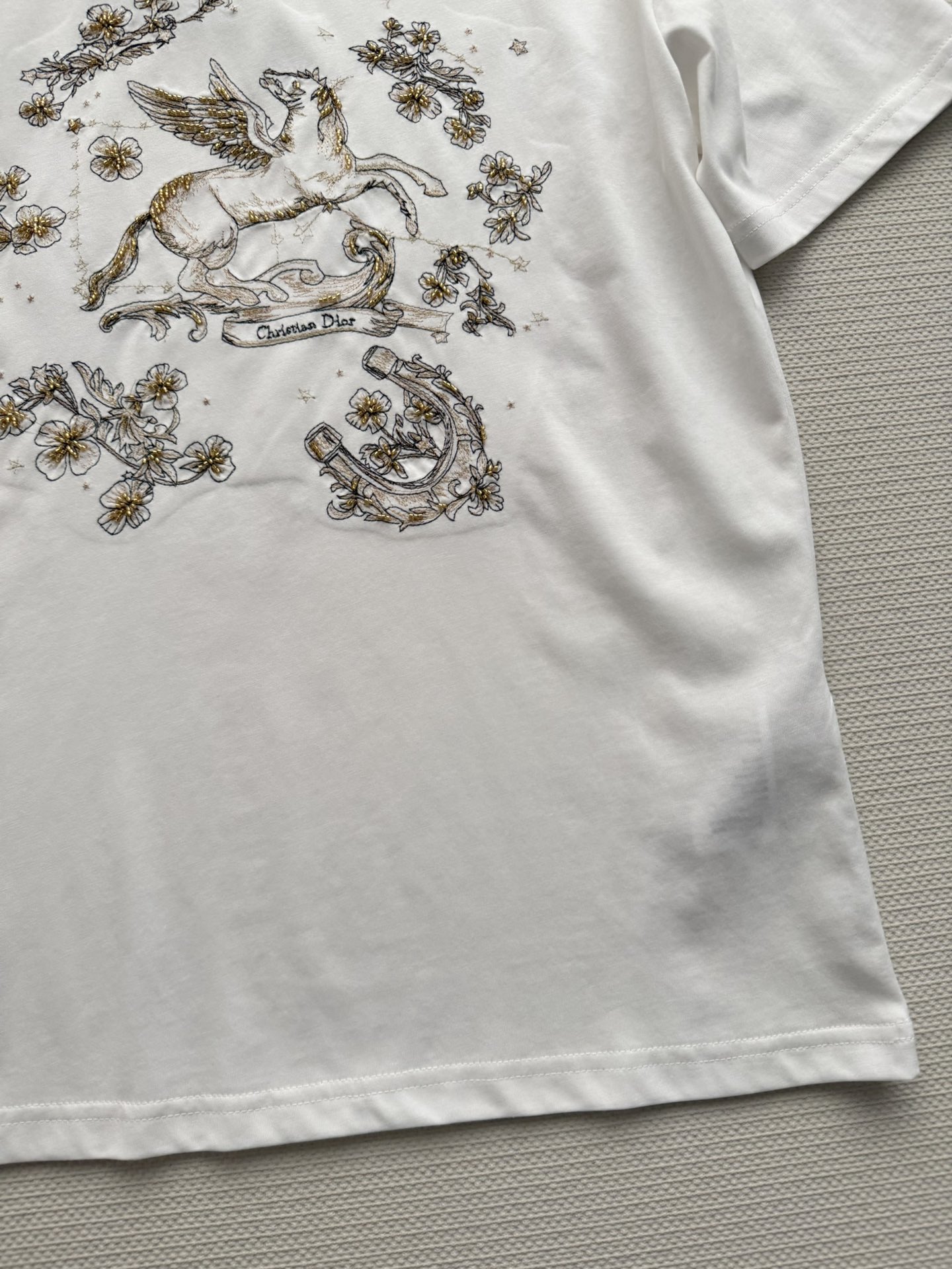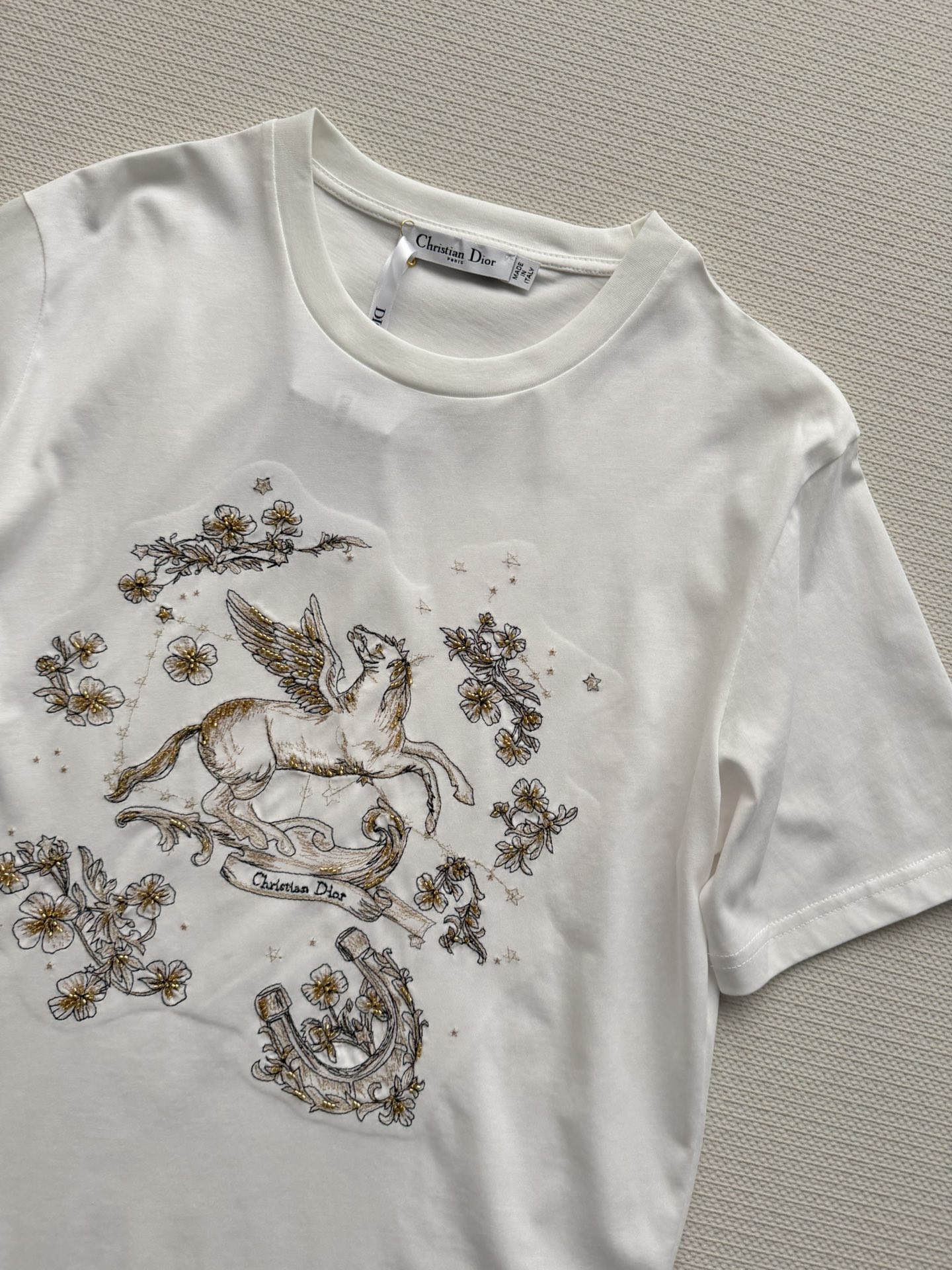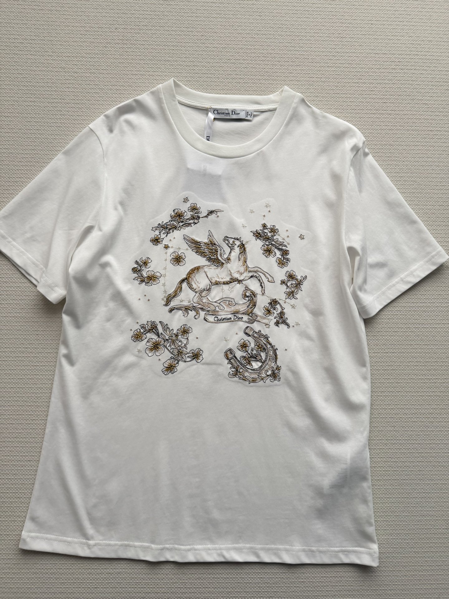Details: Cotton T-shirt with golden horse print, round neck, loose fit, easy to match.