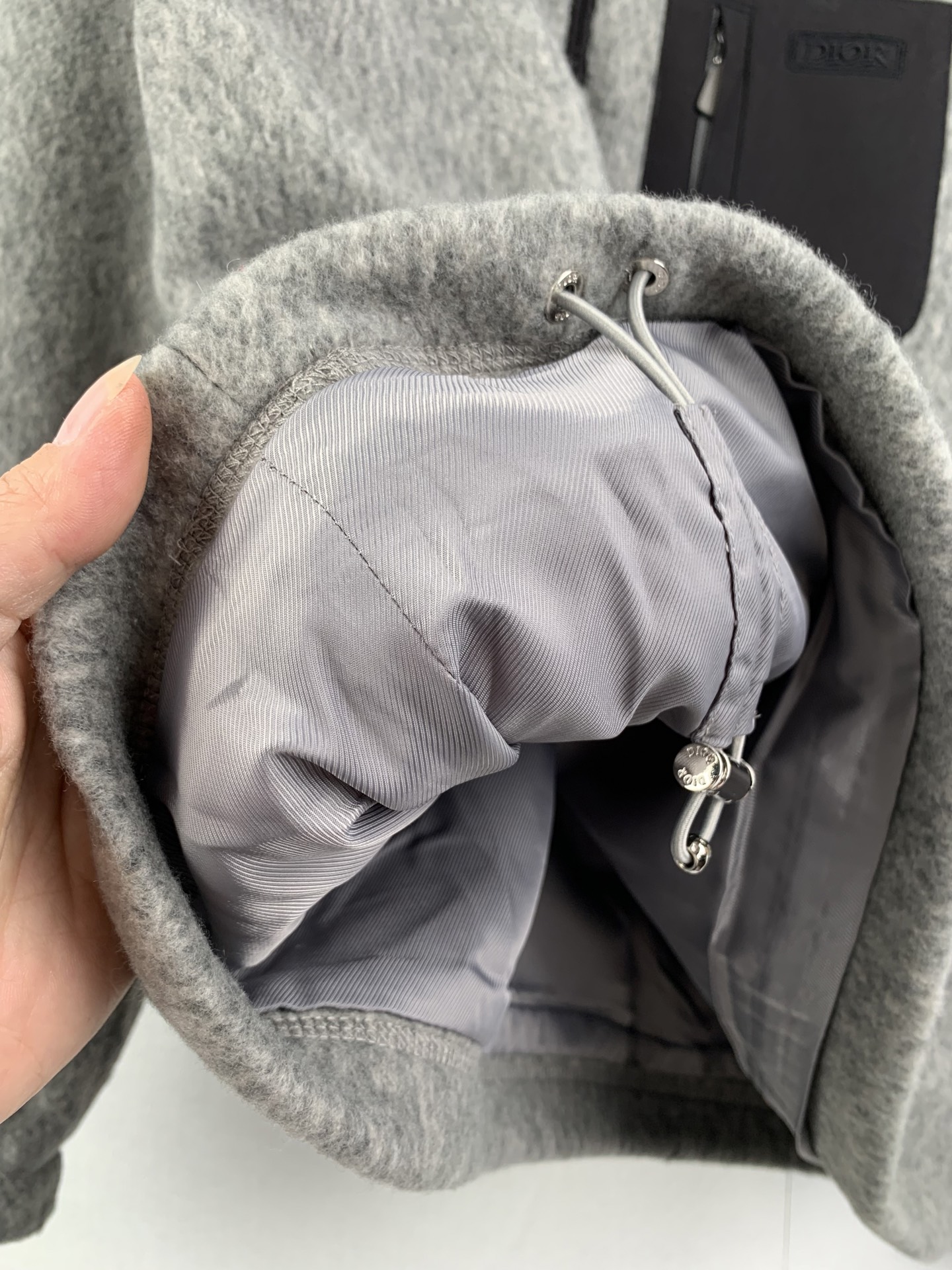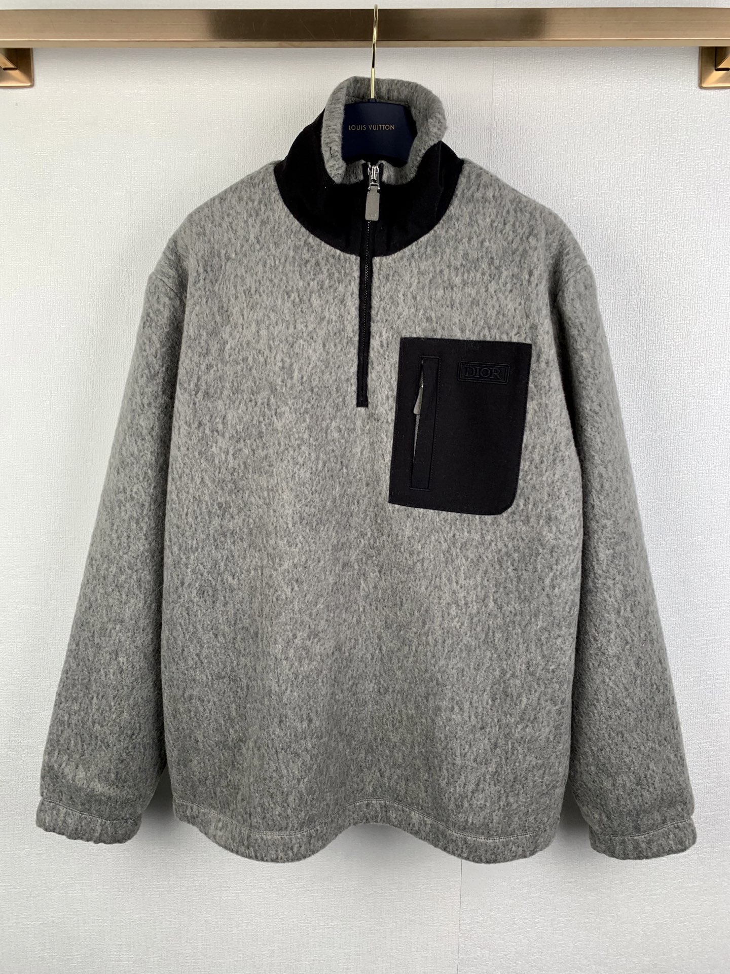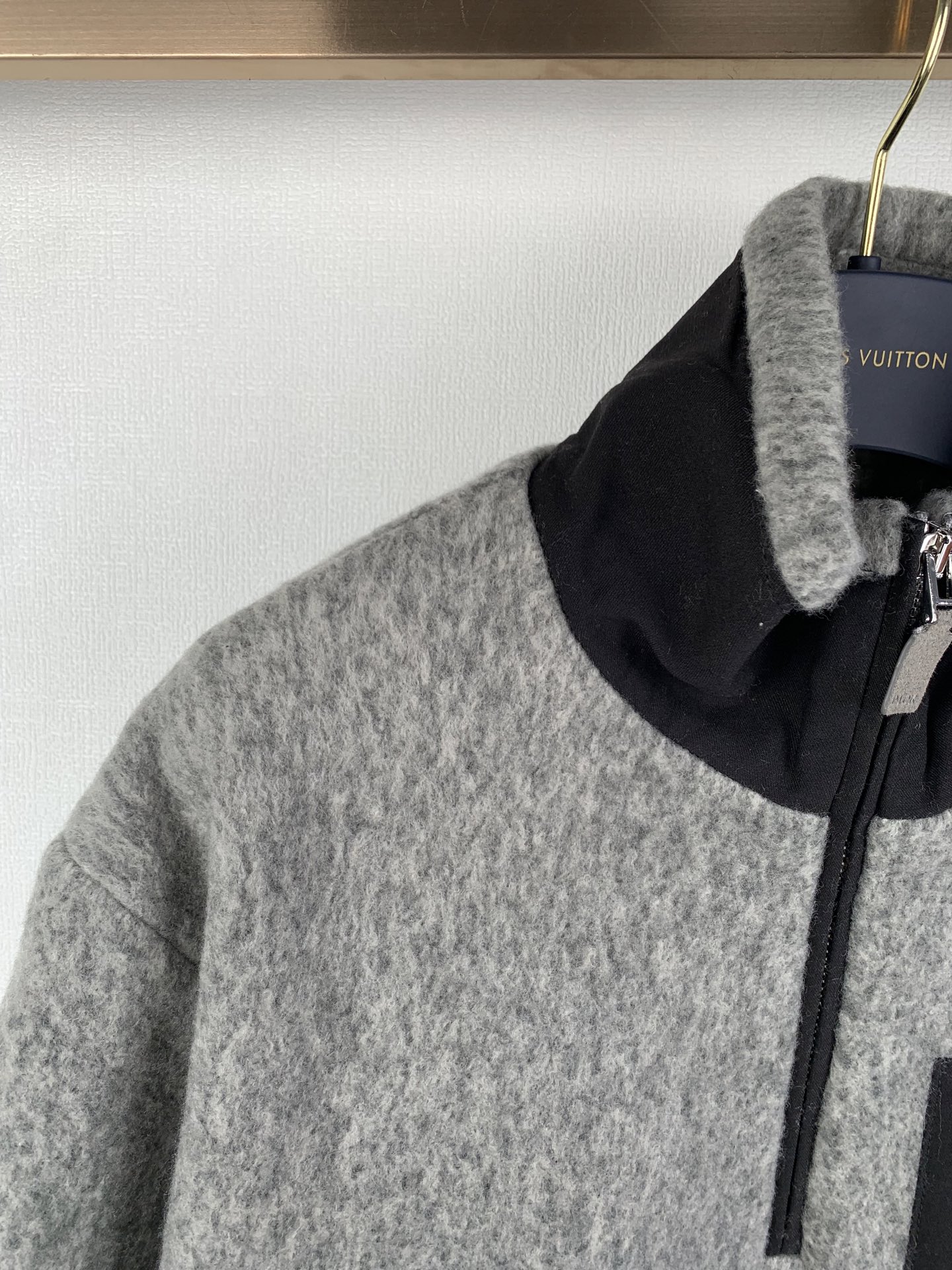 Details: White cashmere and wool fleece sweatshirt with zip collar and contrast details.