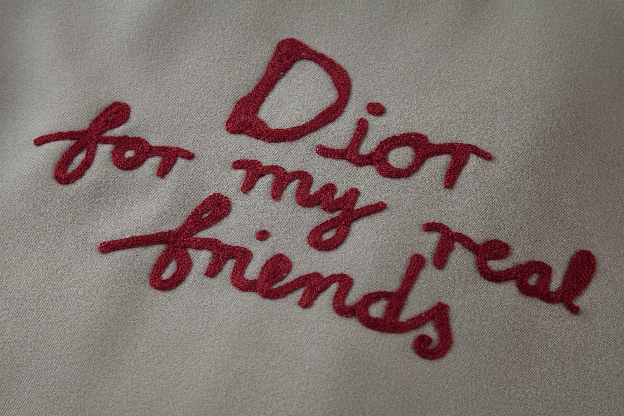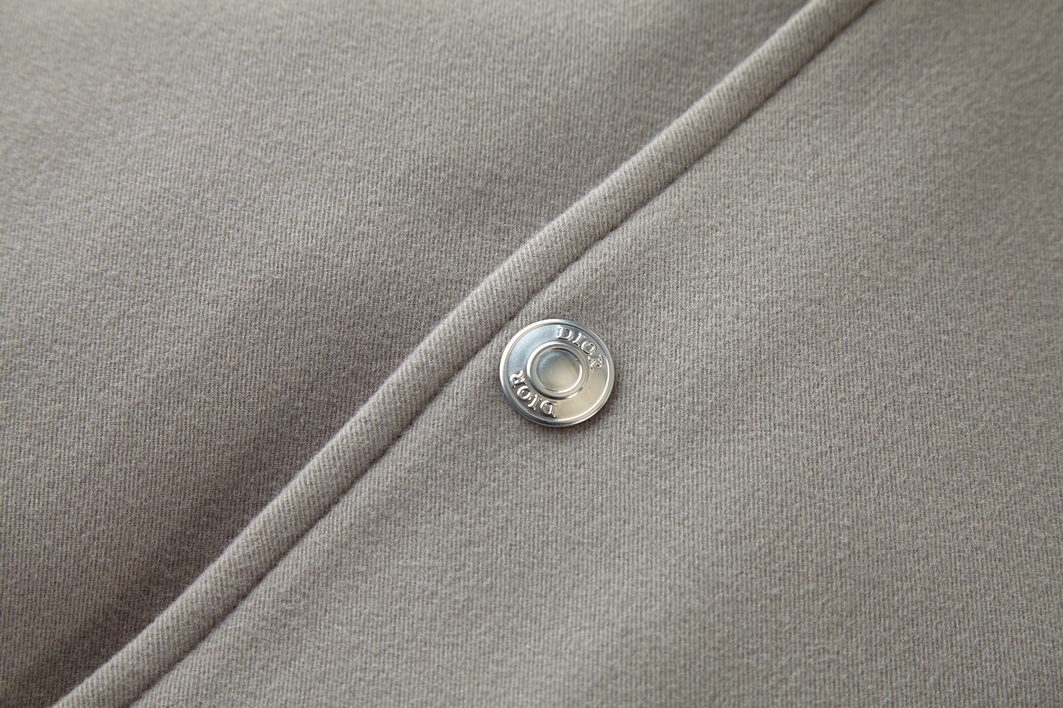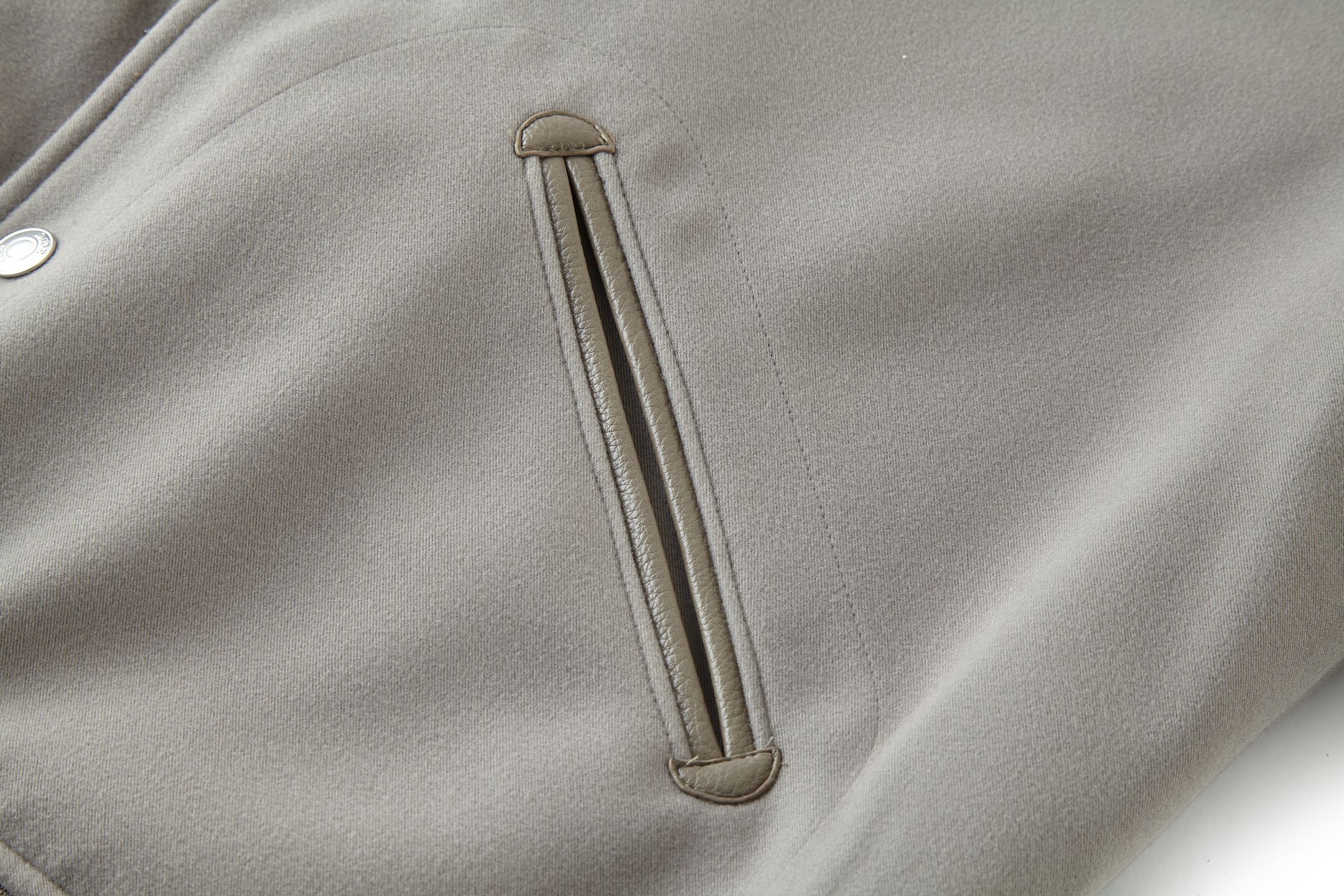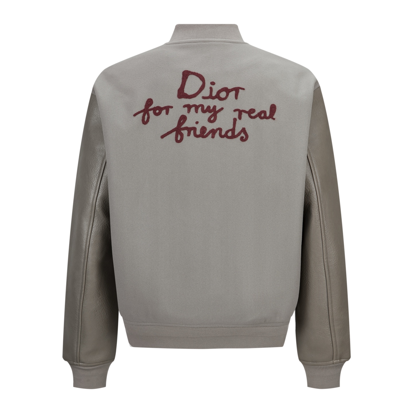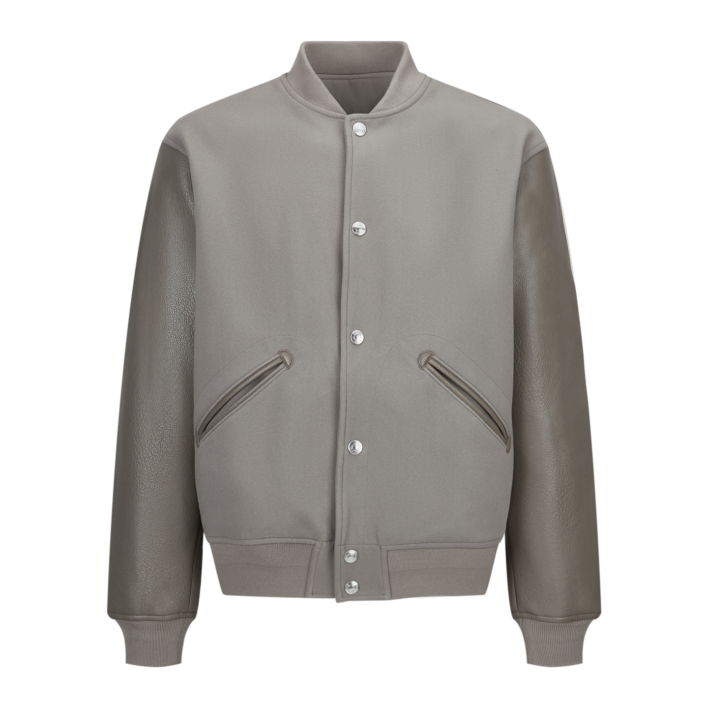 Details: Beige leather baseball jacket with logo embroidery and suede sleeves