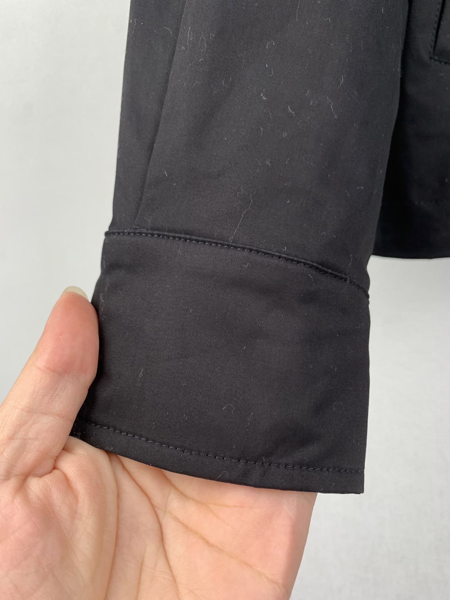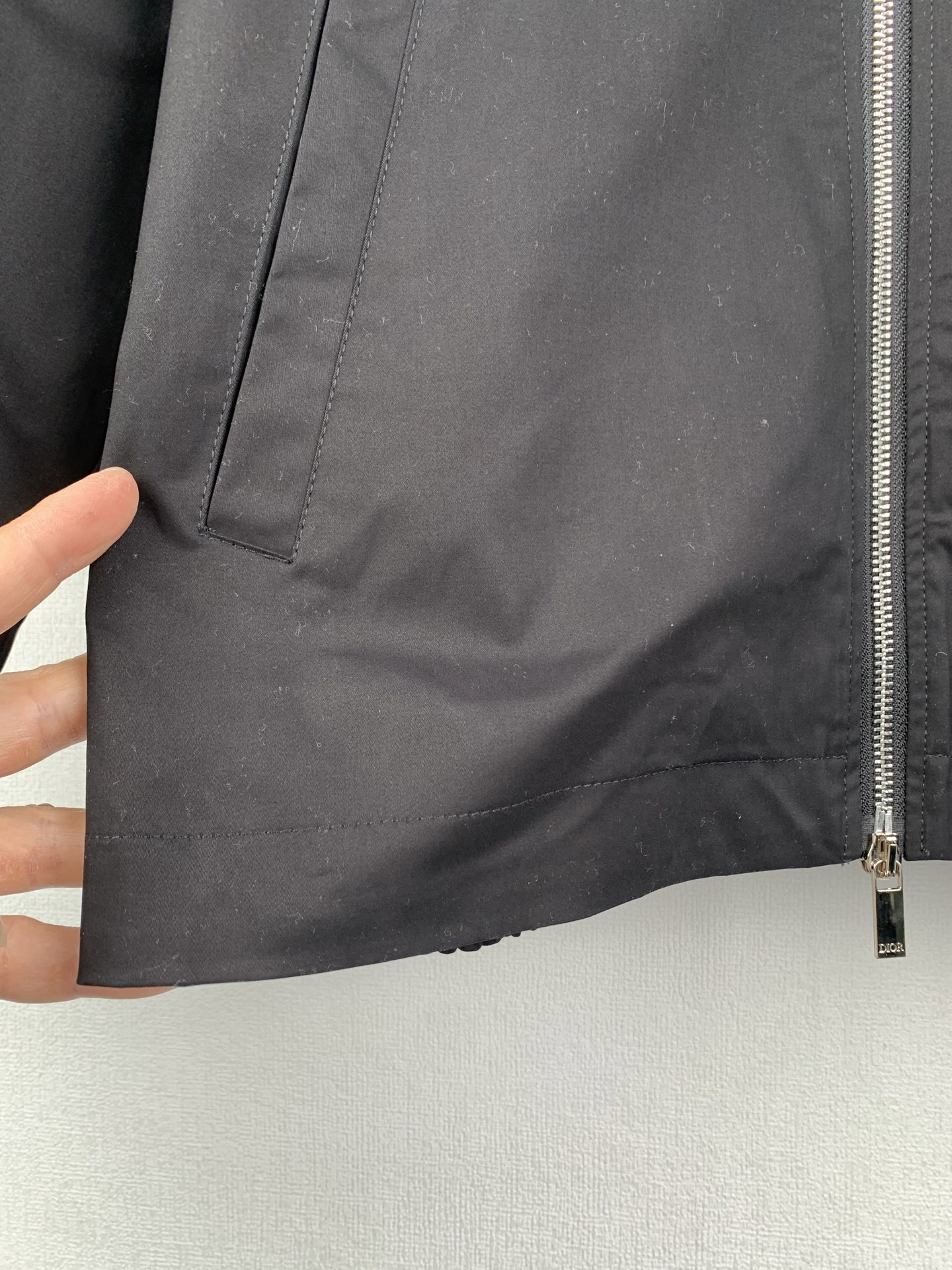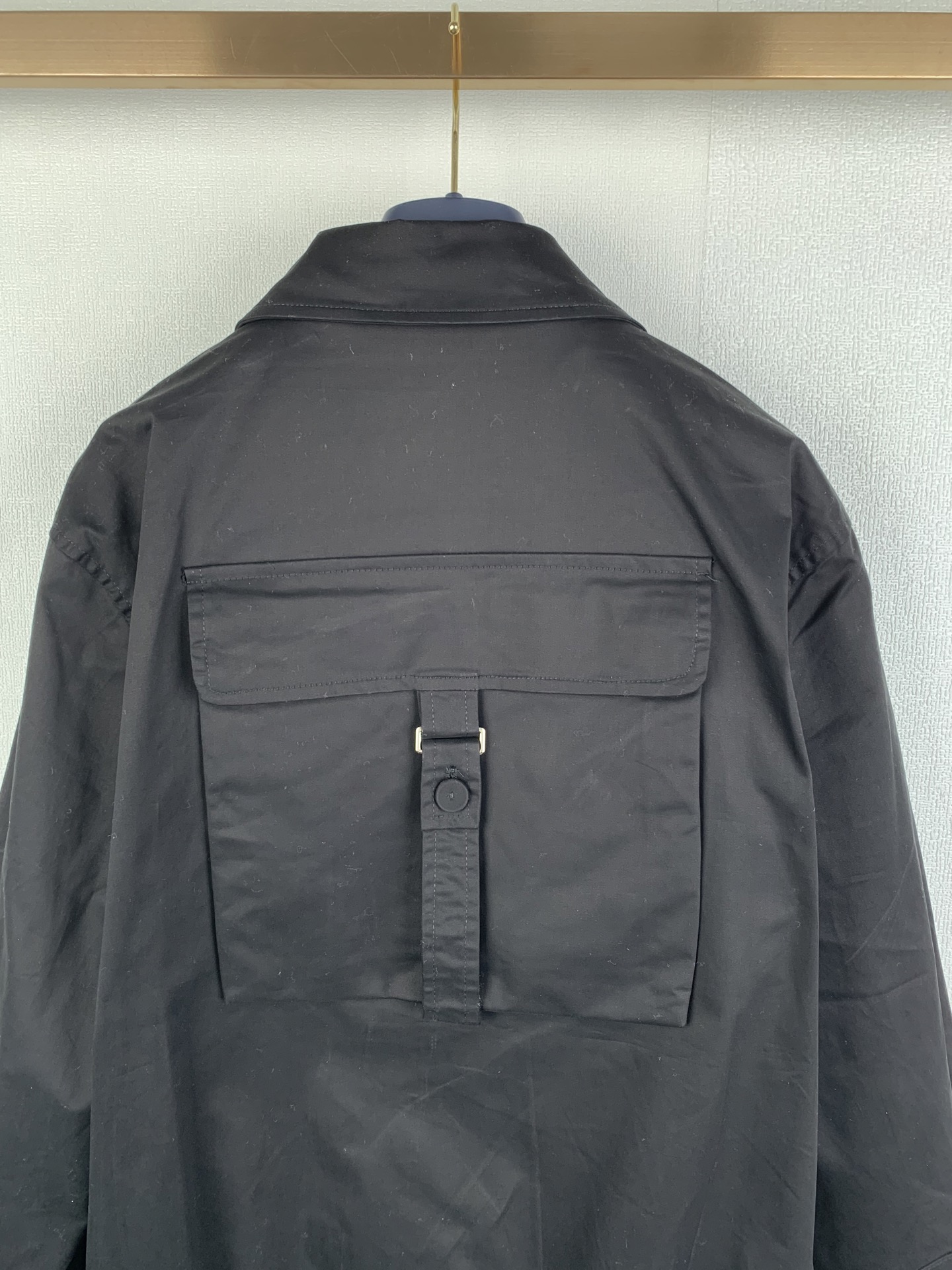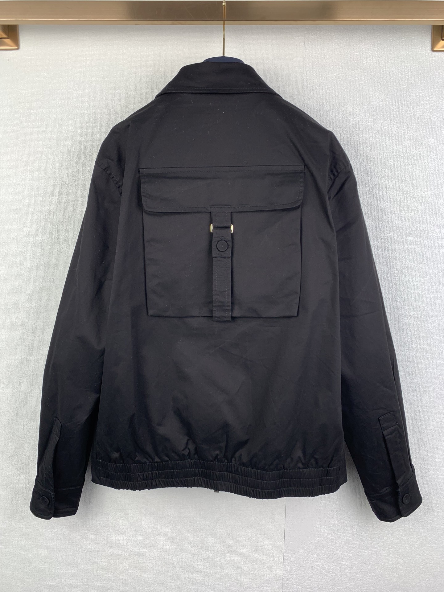 Details: Black double-sided cotton blend satin jacket with a unique back pocket.