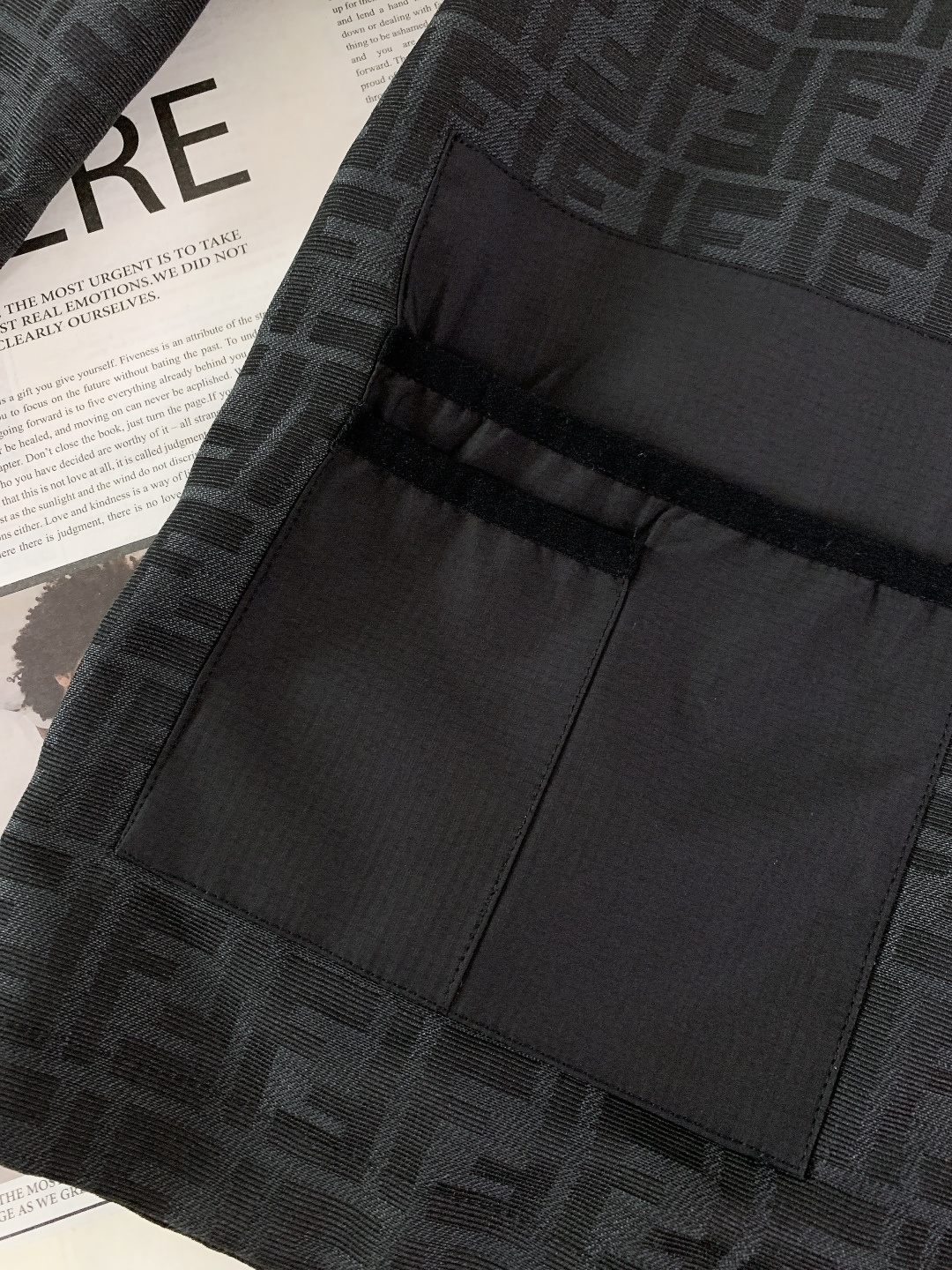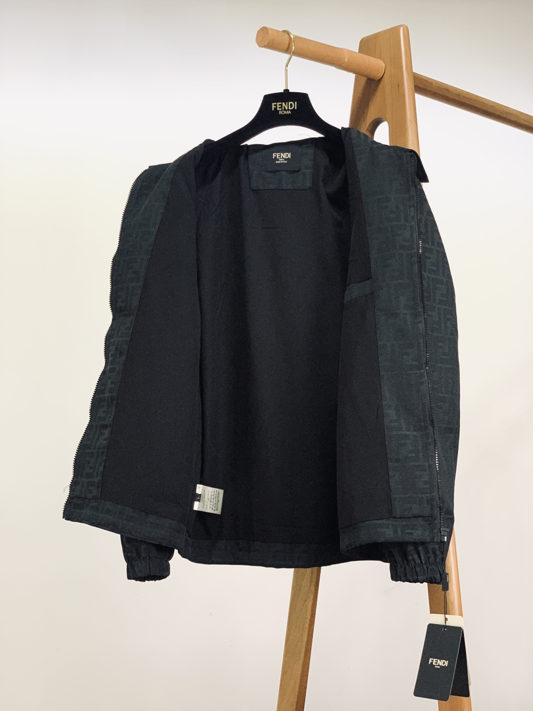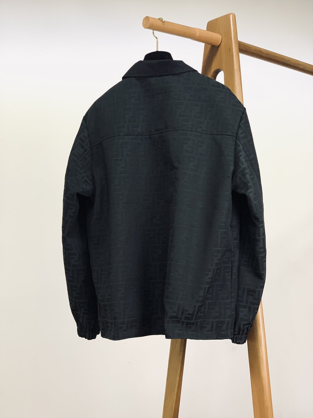 Details: Black jacket with brand - printed texture, fashionable and well - crafted
