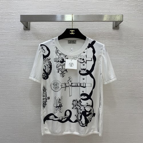 Details: New high-end custom silk and cotton blend knitted top with retro print, available in black and white, S size. High-quality craftsmanship.