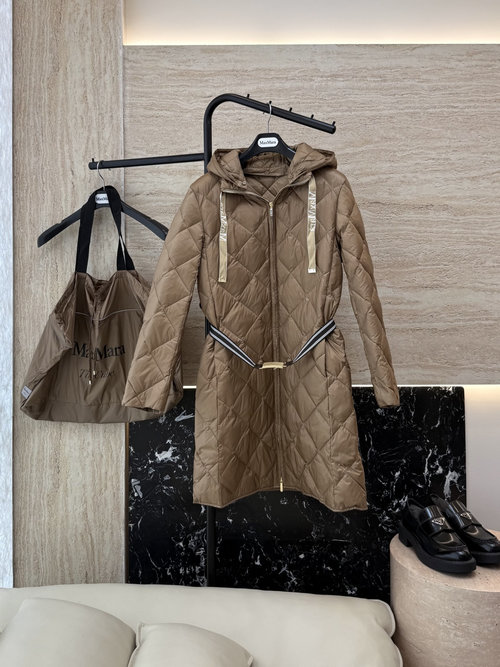 Details: 90% white goose down hooded slim-fit zippered down jacket in black, light gold, lime white, with custom belt and storage bag.