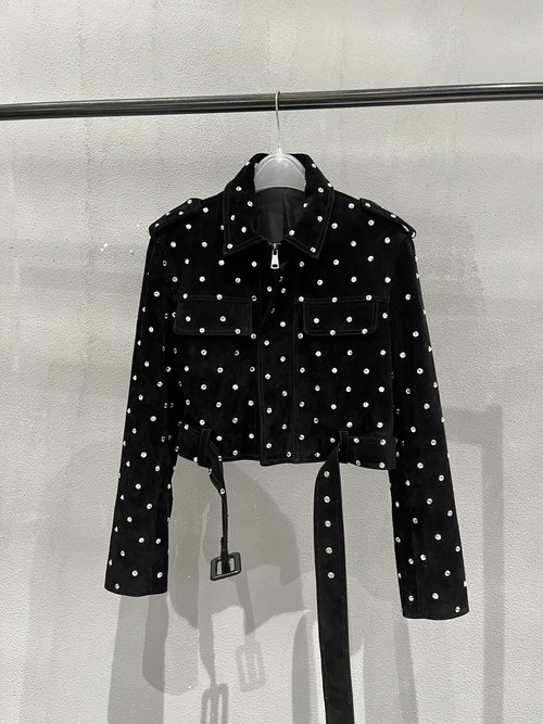Details: Stylish short goatskin motorcycle jacket with hot - drilled rhinestones. High - end customization, fine workmanship