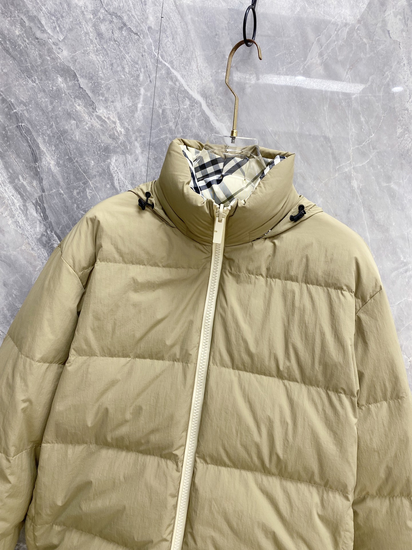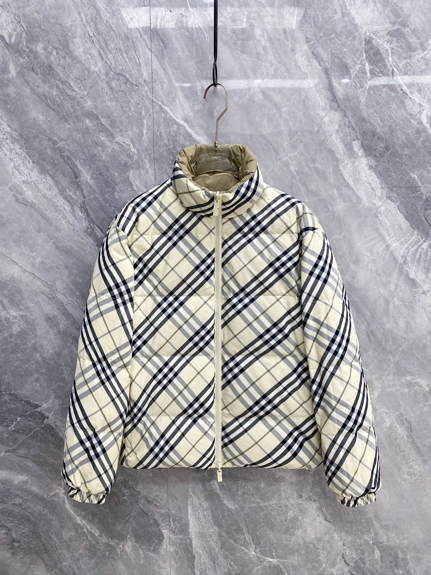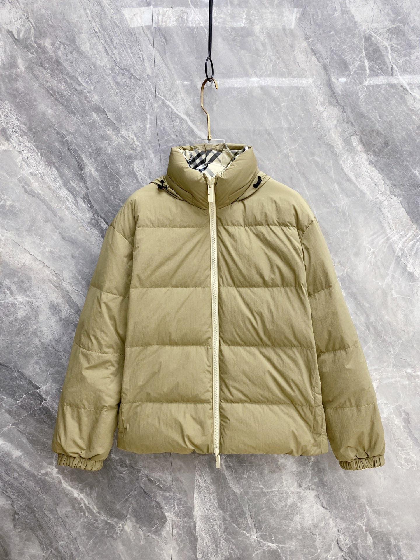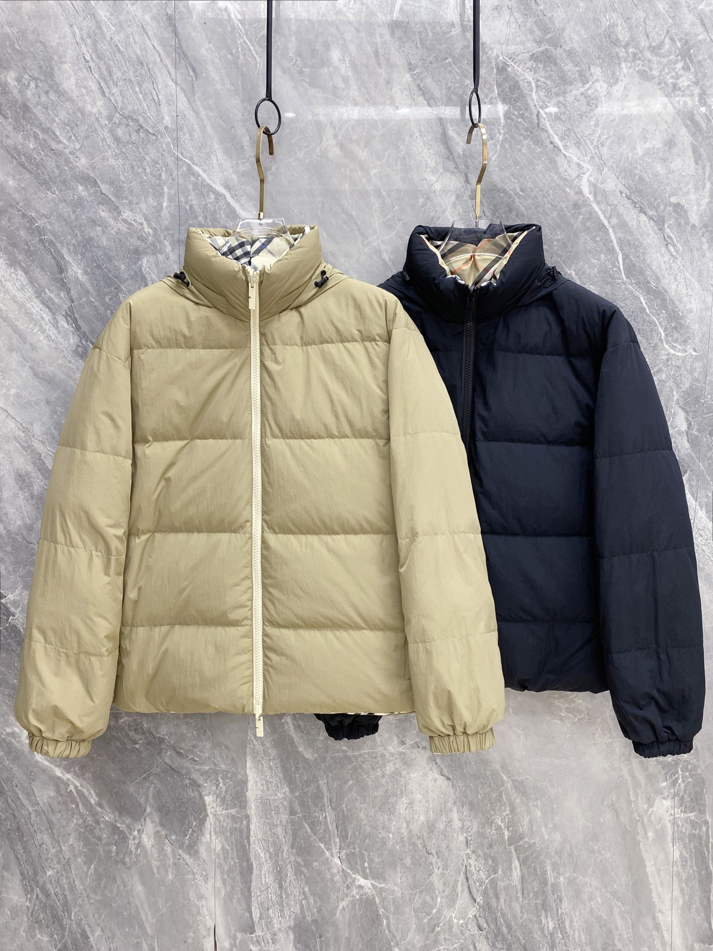 Details: Double-Faced Stand-Collar Down Jacket Made of Eco-Friendly Polyester Fabric, Wrinkle-Resistant, Windproof, and Warm. Comes with a Logo Badge on the Chest and High-Quality Hardware Accessories.
