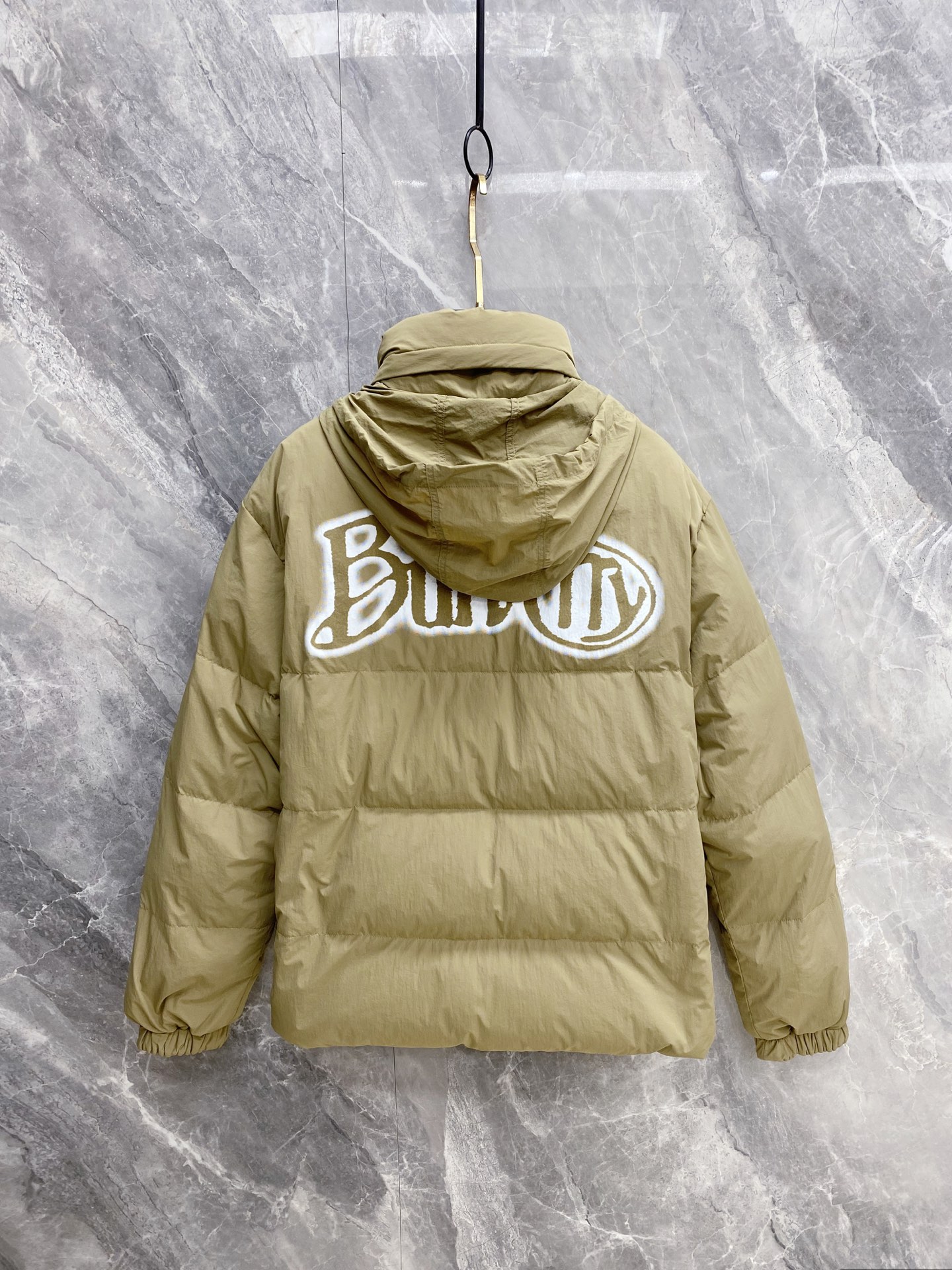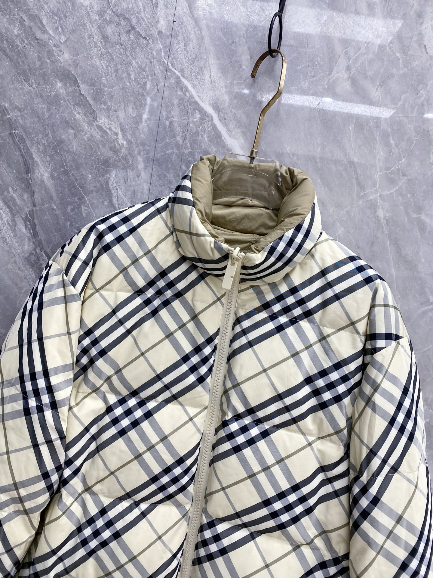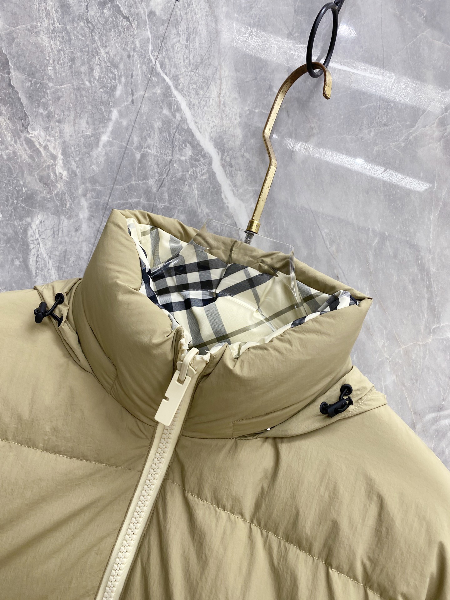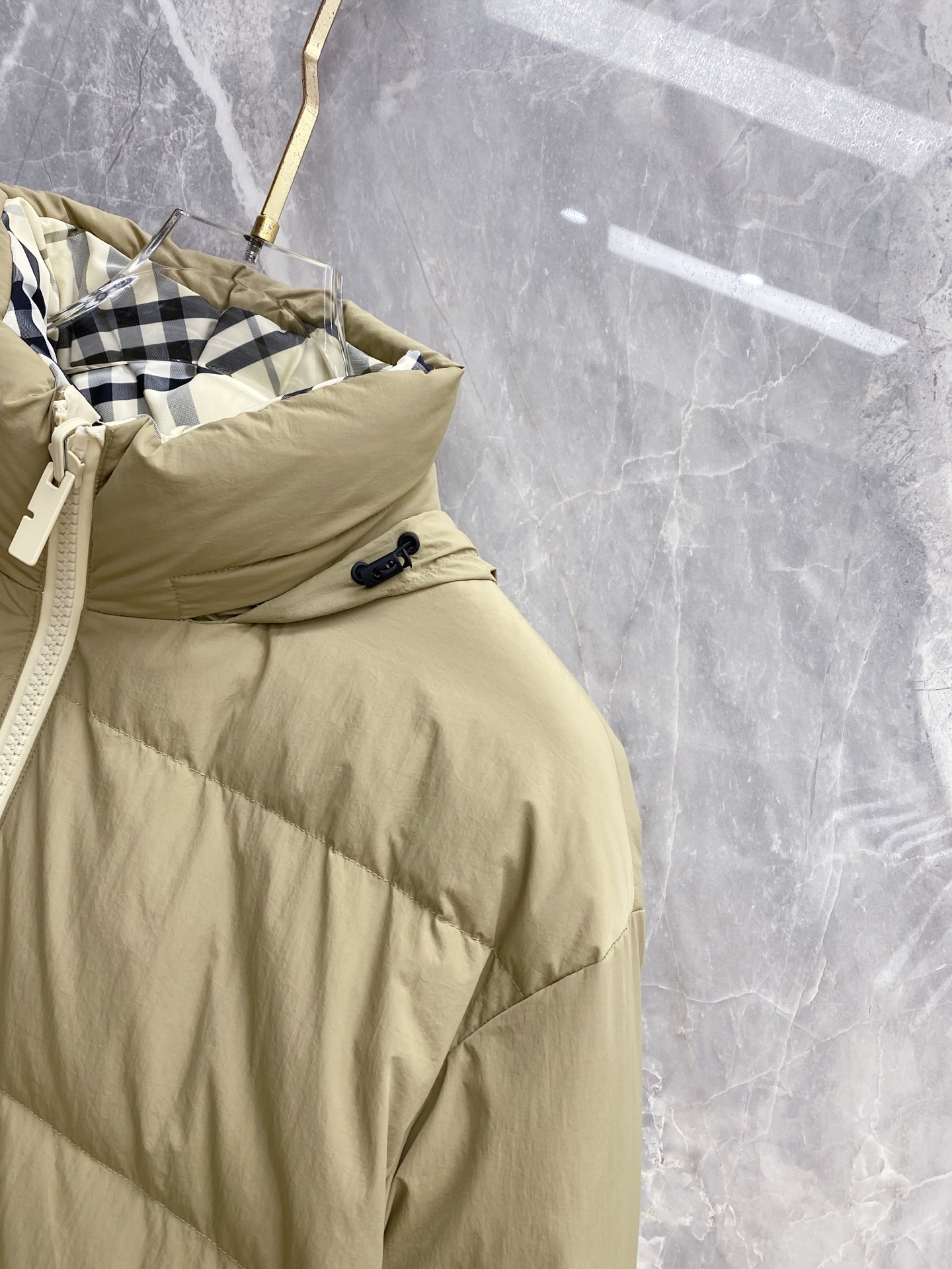 Details: Double-Faced Stand-Collar Down Jacket Made of Eco-Friendly Polyester Fabric, Wrinkle-Resistant, Windproof, and Warm. Comes with a Logo Badge on the Chest and High-Quality Hardware Accessories.